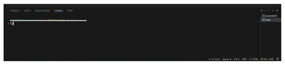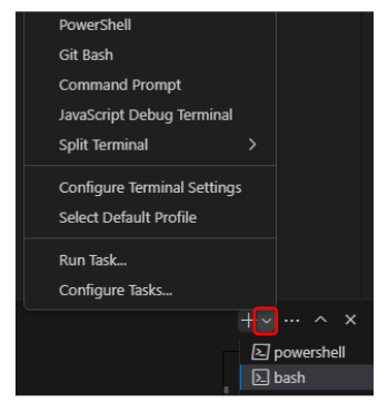 두개를 설치 후 Ctrl + shift + ~를 누르면 consol창이 나타난다. 화면 오른쪽에 powershell있고 그림2 처럼 표시한 아이콘을 을 누르면 Git bash로 작업할 수있는 선택창이 나타나고 git bash를 선택해 진행한다.